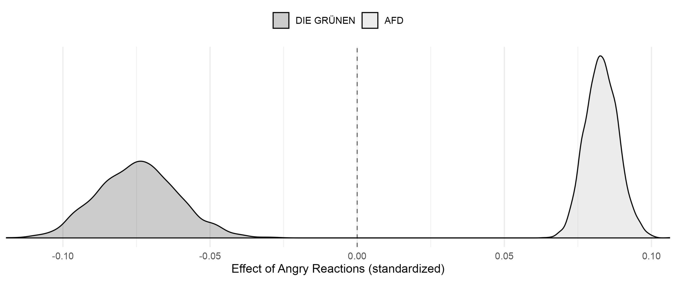 Posterior distributions of the effect of standardized Angry reactions on daily share counts from the longitudinal negative binomial model. AfD shows a small positive effect, while Die Grünen show a negative effect. Dashed vertical line indicates a null effect (0).
