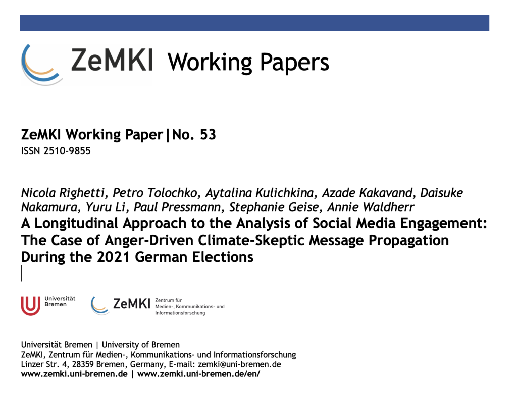 I am pleased to share a new publication, “A Longitudinal Approach to the Analysis of Social Media Engagement: The Case of Anger-Driven Climate-Skeptic Message Propagation During the 2021 German Elections,” published as ZeMKI Working Paper No. 53 (2025) by the Centre for Media, Communication and Information Research (ZeMKI), University of Bremen.