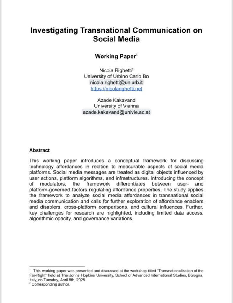 This paper was presented and discussed at the workshop titled Transnationalization of the Far-Right, held at The Johns Hopkins University, School of Advanced International Studies, Bologna, Italy, on Tuesday, April 8th, 2025. It marks the beginning of an effort to systematically conceptualize and operationalize the study of transnational communication on social media.
