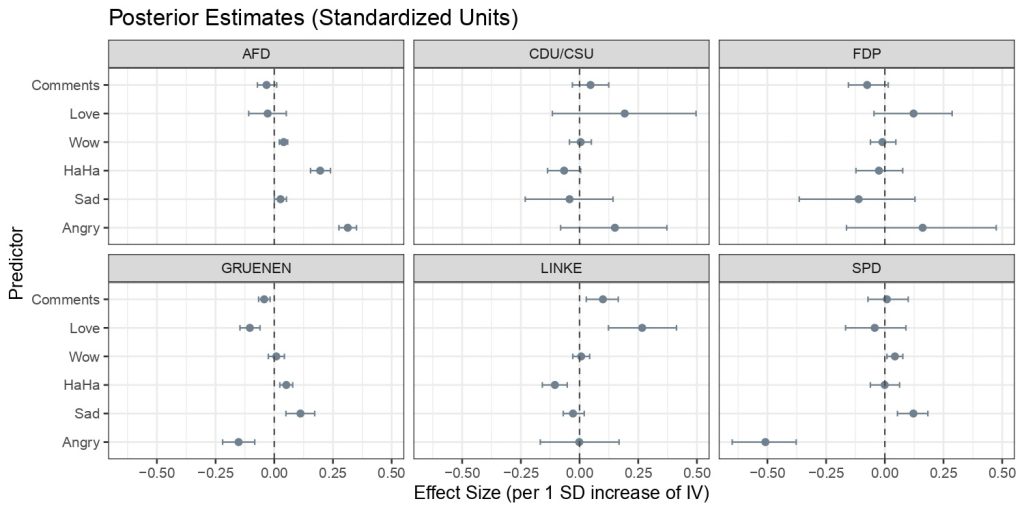 - The Power of Emotion (and Anger): Interestingly, although the right-wing and climate-skeptic party AfD (Alternative for Germany) posted comparatively less environmental content, their visual material generated shares second only to the Greens and elicited the highest levels of user anger. Statistical analysis I conducted shows that anger reactions are a stronger predictor of AfD shares. This indicates a powerful—albeit polarizing—emotional dynamic driving the spread of climate-skeptical narratives.