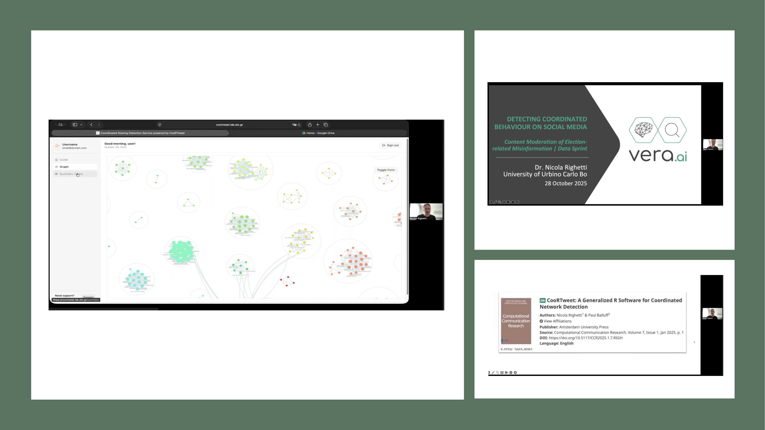 In my presentation, I highlighted key issues in coordinated networks and detection methodologies, focusing on CooRTweet, which I developed with Paul Balluff, and its interface, the Coordinated Sharing Detection Service, created as part of the Horizon Vera.AI project with the Athens Technology Center (ATC). The research team will use this tool alongside other digital methods throughout the project.